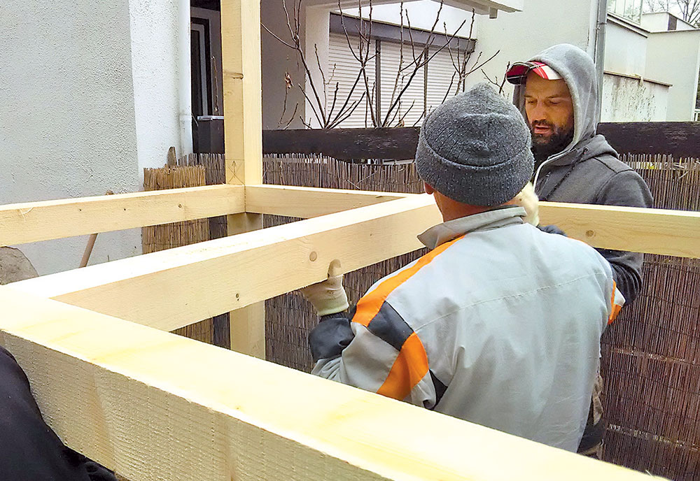 Konštrukčný rám vytvárame ukladaním jednotlivých hranolov do kotvenia, kde ich prichytávame dlhými skrutkami o jednotlivé pätky.