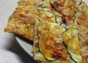Vyvaľkané lístkové cesto potriete troškou olivového oleja a kyslou smotanou. Cuketu, slaninu a cesnak nakrájame na tenké plátky a uložíme na cesto. Vrch posypeme mletým čiernym korením a strúhaným syrom. Pečieme v rúre predhriatej na 170 stupňov do zlata.