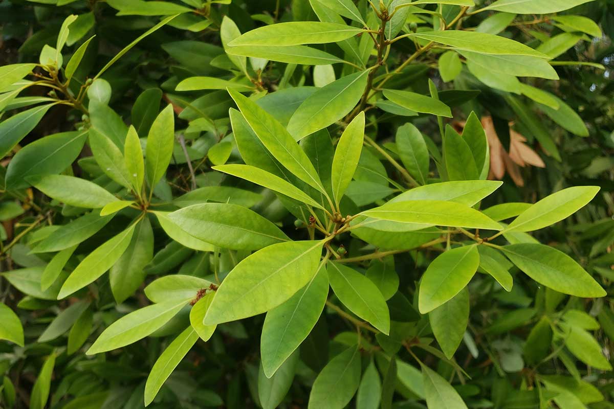 Táto drevina má elipsovité, sýtozelené a lesklé listy. Počas jesene sa sfarbujú do žltej, neskôr oranžovej až červenej farby.