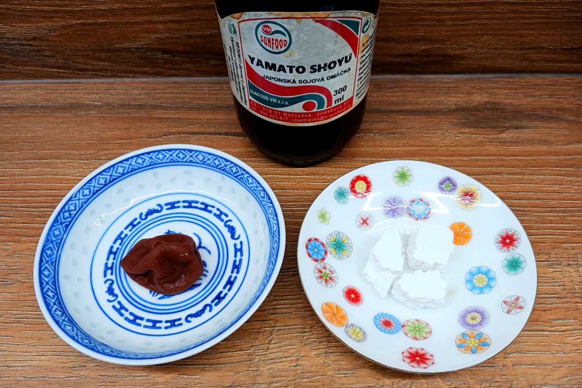 2. Potom znížime plameň, pridáme rozotretú slivku umeboshi a niekoľko kvapiek sójovej omáčky.