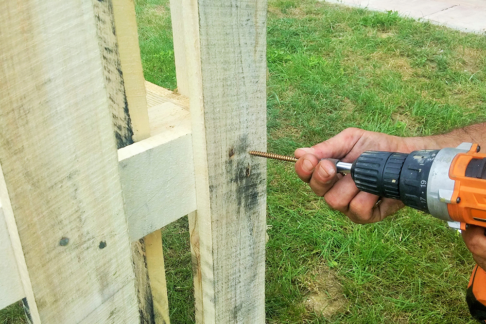 Z ôsmej palety vyrežeme laty a vybudujeme z nich okrajový lem kompostéra, ktorý pripevníme skrutkami.