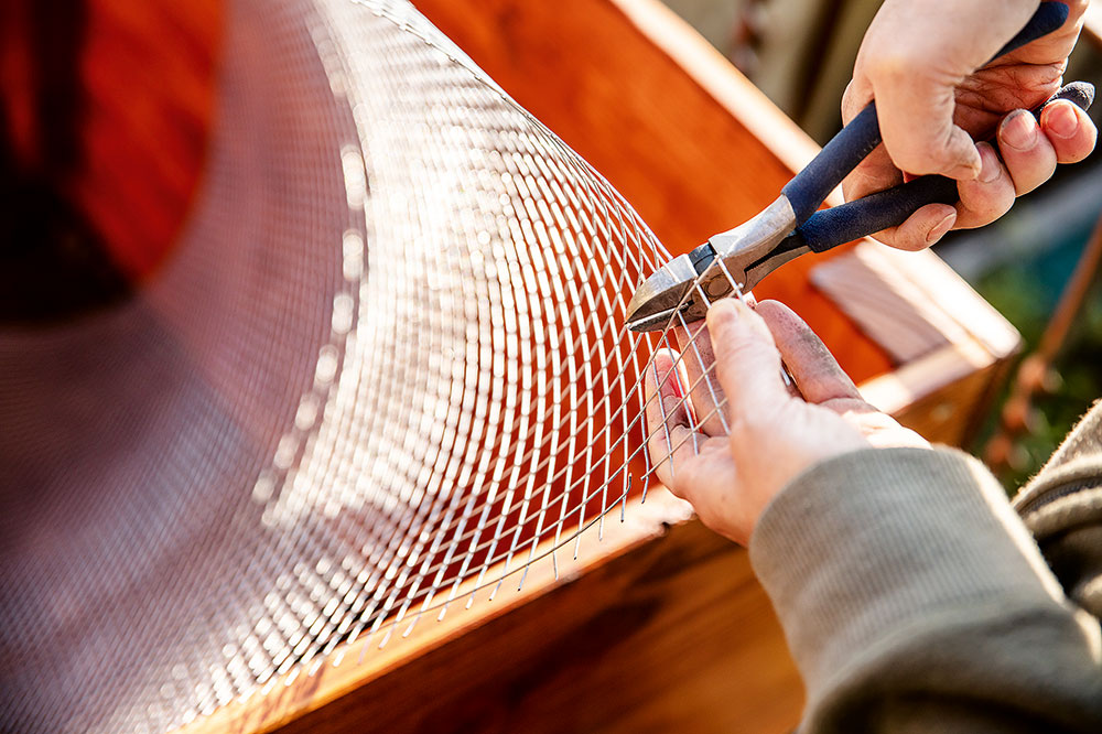 Sieťku s drobnými okami (napríklad zajačie pletivo) vystrihneme s presahom cca 10 cm na každej strane. Vložíme ju na dno, presah ohneme a drobnými klinčekmi nahusto pribijeme o dosky.
