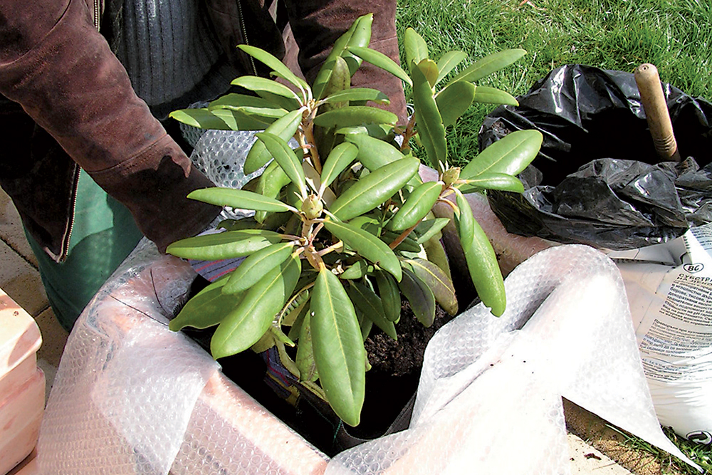 V prípade silných mrazov alebo zimných slnenčných dní bez snehovej prikrývky obalíme vždyzelené druhy do vliesovej fólie.