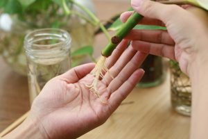 Koniec pripraveného odrezka namočíme do hrnčeka s vodou. Vďaka tomu nám na stonku lepšie priľne stimulátor.