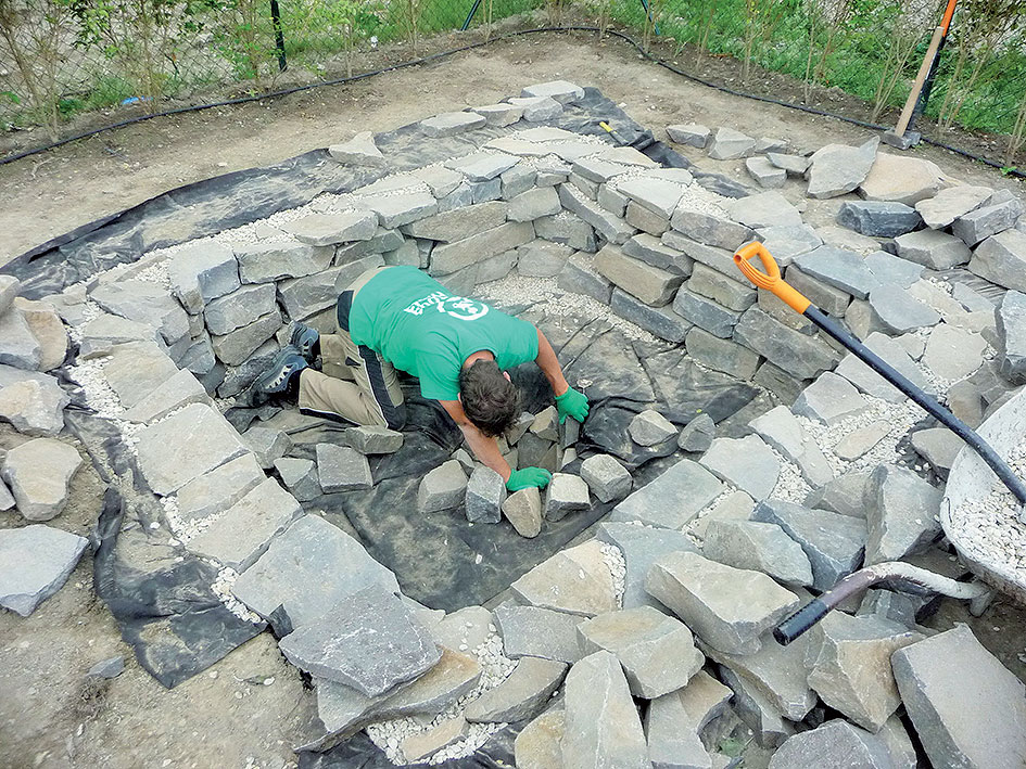 Na hotovú jamu rozprestrieme geotextíliu a „komín“ preklenieme drevenými latami. Potom začneme stavať obrubu z čadičových blokov.