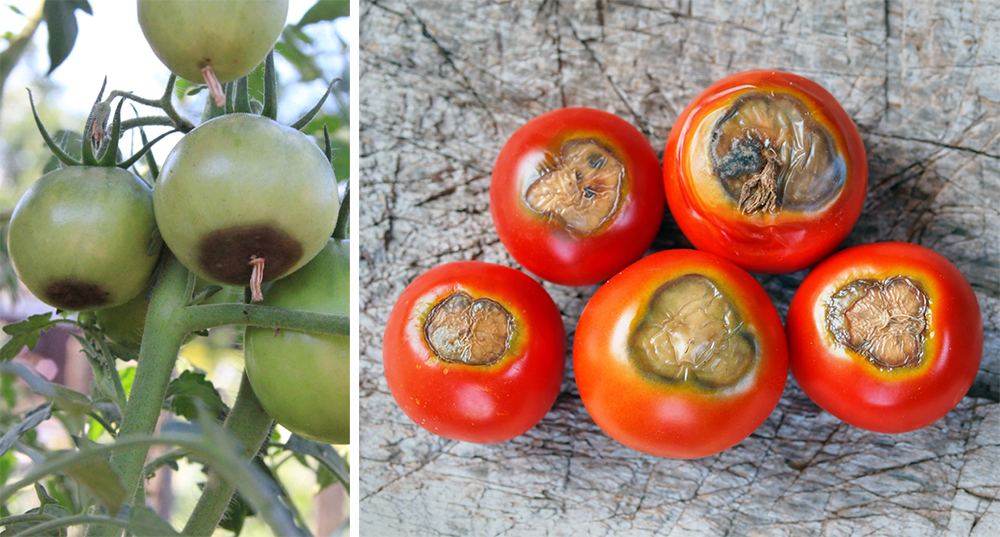 Fyziologická nekróza kvetného konca plodov paradajok aj paprík je vyvolaná nedostatkom vápnika v pôde. Za vlhkého počasia sú nekrotické škvrny sivé, mokré, niekedy druhotne pokryté saprofytickými hubami. Za sucha škvrny zasychajú, sú vpadnuté až čierne.