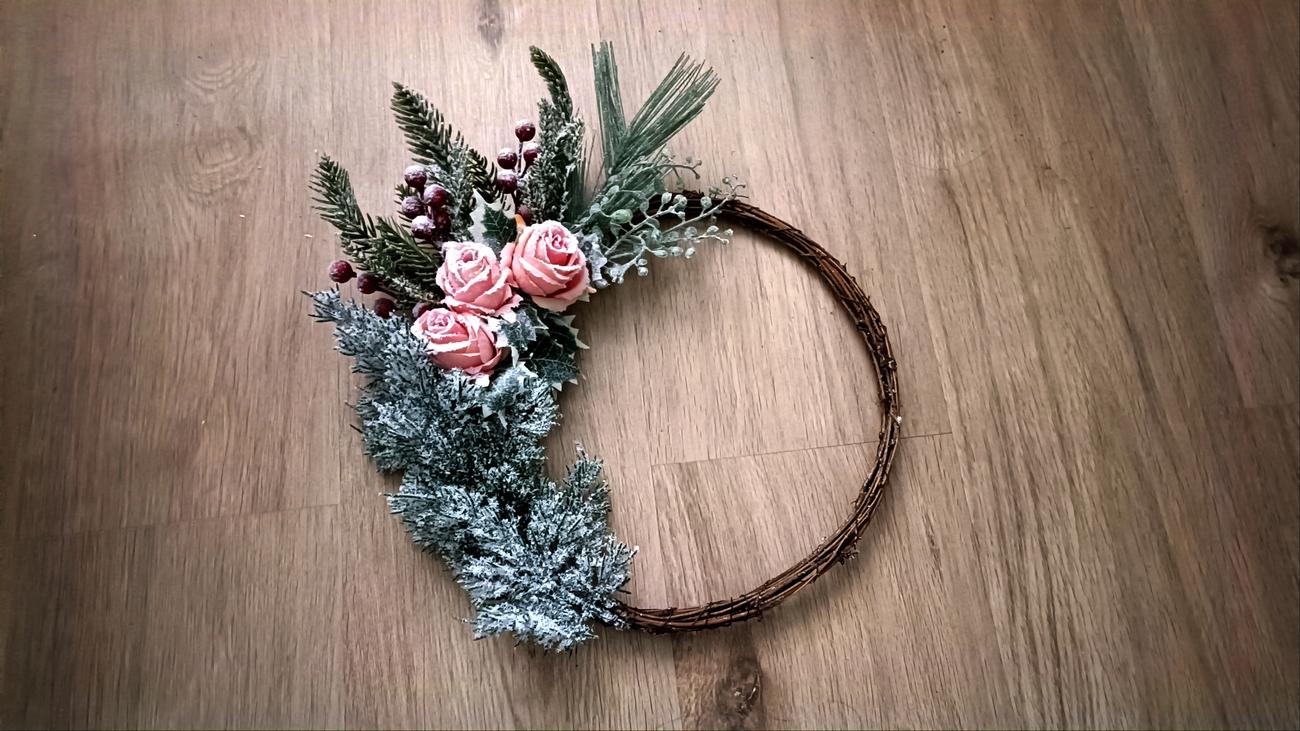 Vianočný veniec, v ktorom dominujú tri zasnežené svetloružové ruže obklopené rôznymi druhmi vetvičiek, ktoré sú položené na prútenom podklade. Veľkosť prúteného kruhu s ozdobou cca 31 cm, bez výzdoby 28 cm. Veniec je možné otočiť podľa vlastného vkusu.