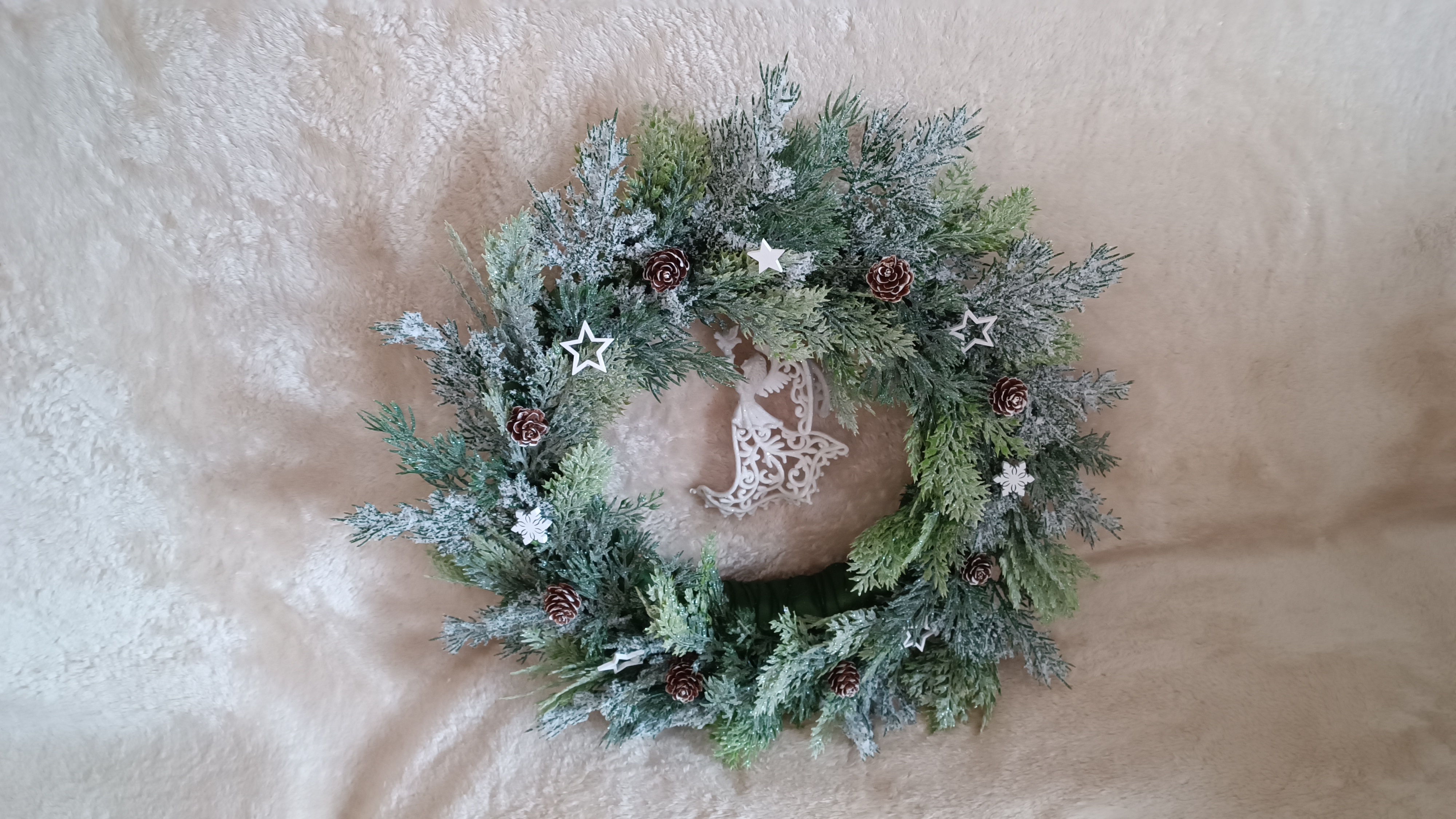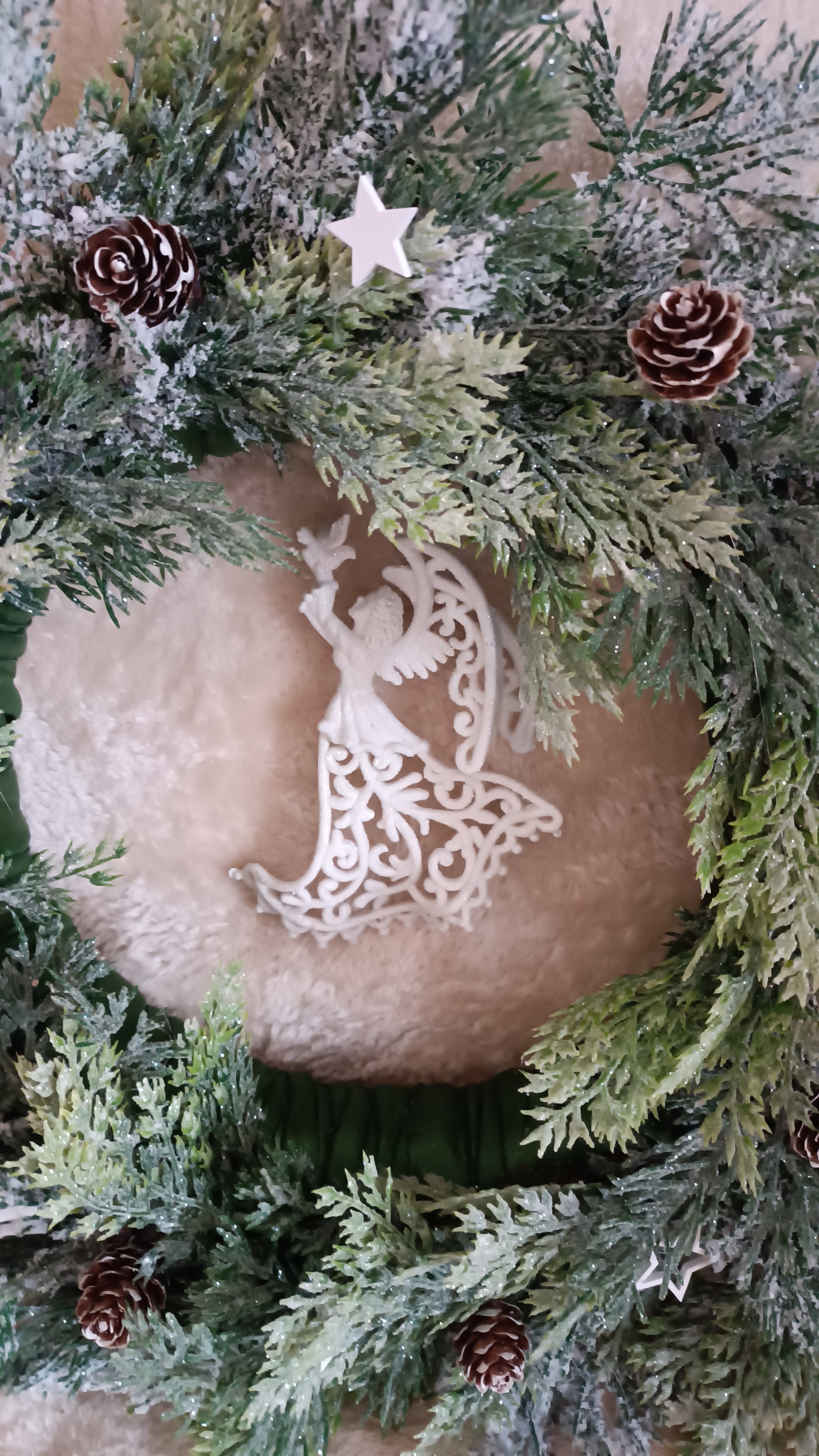 Vianočný veniec ozdobený 3 druhmi čečín (zasnežená, svetlá a tmavá tuja), šiškami, hviezdami, v strede je zavesený anjel s holubicou. Veľkosť cca 44 cm.