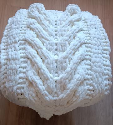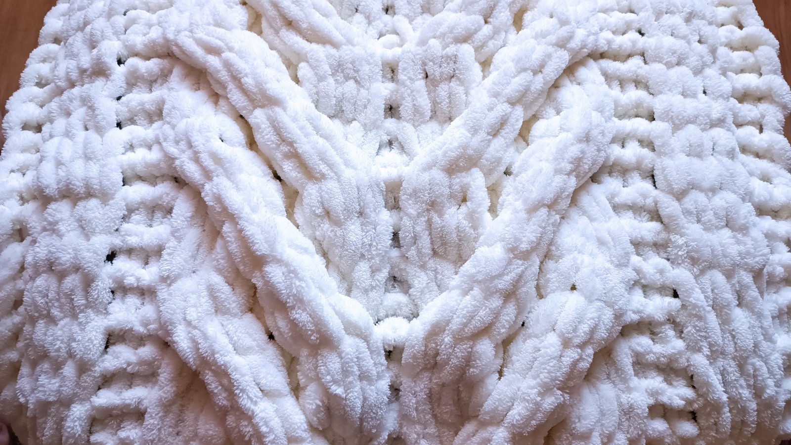Detská deka krémovej farby, veľkosť cca 60 cm x 75 cm, vyrobená z priadze alize puffy, príjemná na dotyk.