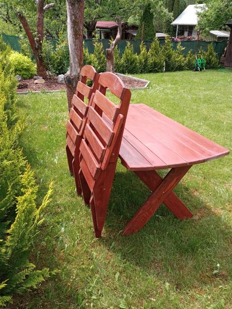 Predám záhradný stôl s dvoma stoličkami, ručná výroba. Nepoužívané, ako nové. Rozmery stola: 150x75x73 (dl*š*v) Odtieň mahagón. Osobný odber Košice.