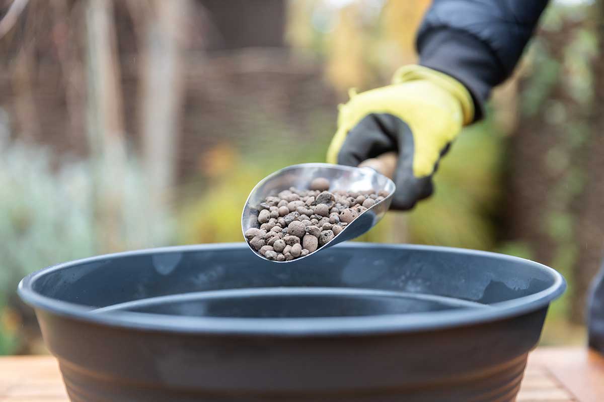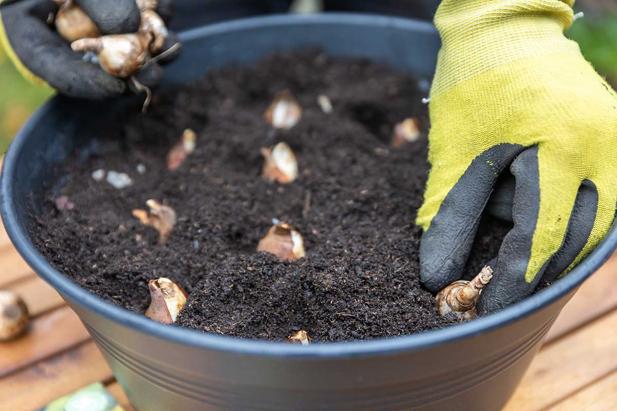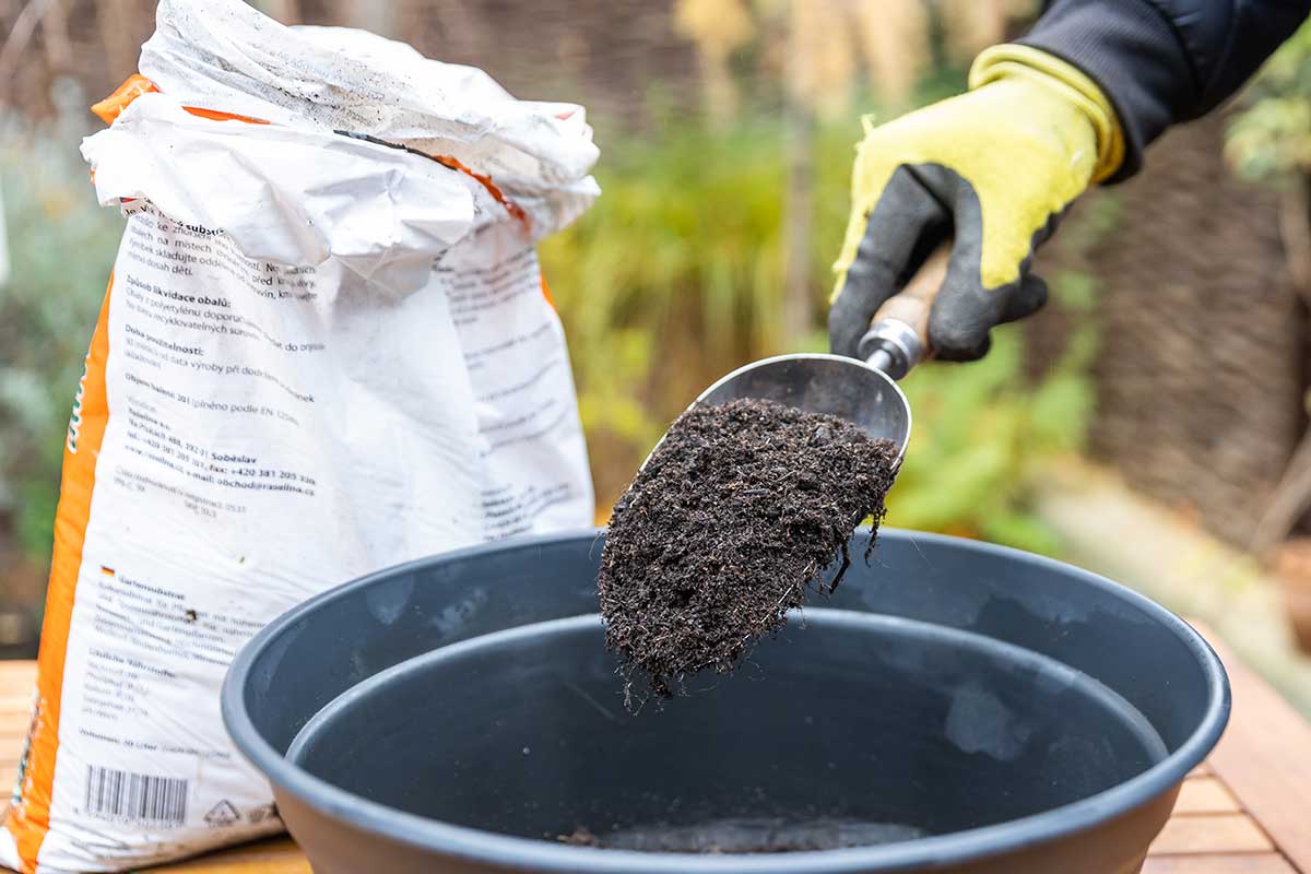 Substrát pre cibuľoviny a hľuznaté rastliny má byť ľahší, obohatený o hrubší piesok, ideálne kyprý a priepustný. Vybranú mrazuvzdornú nádobu ním naplníme najskôr do výšky asi 10 – 15 cm.