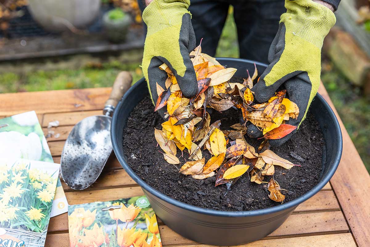 Hľuzy jarných rastlín a drobné jarné cibuľoviny rozmiestnime na povrch ďalšej vrstvy, ktorú opäť zasypeme asi 5 – 10 cm vrstvou substrátu. Ak je suchšia jeseň, pravidelne zavlažujeme. Pred zimou zakryjeme napríklad suchým lístím.